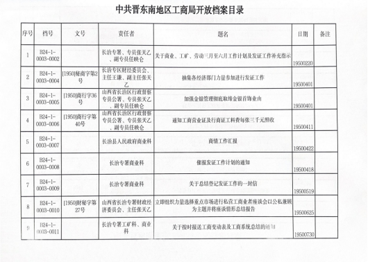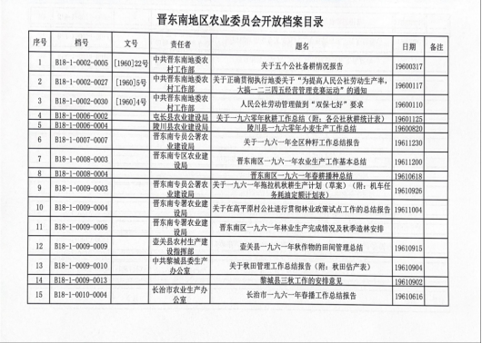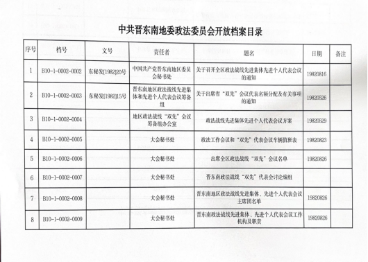 本次开放档案涉及16个全宗,共开放8618件,分别为中共晋东南地委政法委员会、中共晋东南地委老干部局、晋东南地区档案局、晋东南地区农业委员会、晋东南地区财贸办公室、晋东南地区知青办公室、晋东南地区工商局、晋东南地区审计局、晋东南地区司法局、晋东南地区物资局、山西省煤炭运销总公司晋东南分公司、晋东南地区文联、中共晋东南地区对台办、晋东南地区广播事业局、晋东南地区电大工作站、晋东南地区体委,均形成于1950年至1985年。其中中共晋东南地委政法委员会全宗开放159件;中共晋东南地委老干部局全宗开放198件;晋东南地区档案局全宗开放1654件;晋东南地区农业委员会全宗开放293件;晋东南地区财贸办公室全宗开放1571件;晋东南地区知青办公室全宗开放1402件;晋东南地区工商局全宗开放1443件;晋东南地区审计局全宗开放29件;晋东南地区司法局全宗开放139件;晋东南地区物资局全宗开放582件;山西省煤炭运销总公司晋东南分公司全宗开放139件;晋东南地区文联全宗开放183件;中共晋东南地区对台办全宗开放118件;晋东南地区广播事业局全宗开放552件;晋东南地区电大工作站全宗开放28件;晋东南地区体委全宗开放128件。该批档案真实记录了晋东南地区政治建设、经济发展、文化教育等领域的历史全貌,既是党和政府科学决策、工作查考的重要凭证,也是研究晋城地方历史、传承地域文化的珍贵史料。