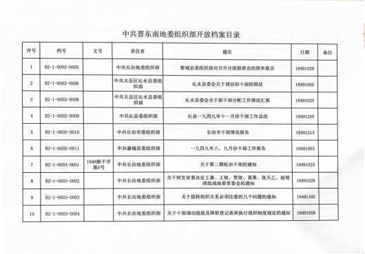 本次开放档案涉及2个全宗,共开放145353件,分别为中共晋东南地区委员会、中共晋东南地委组织部,均形成于1948年至1985年。其中,中共晋东南地区委员会全宗开放11193件;中共晋东南地委组织部全宗开放134160件。该批档案真实记录了晋东南地区政治建设、经济发展、文化教育等领域的历史全貌,既是党和政府科学决策、工作查考的重要凭证,也是研究晋城地方历史、传承地域文化的珍贵史料。