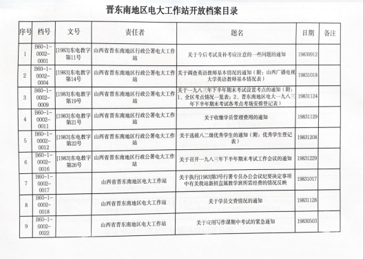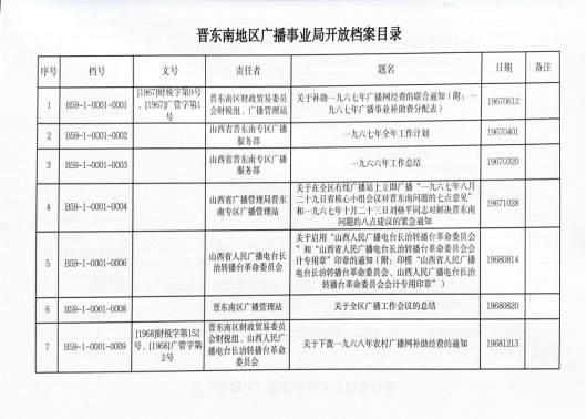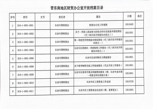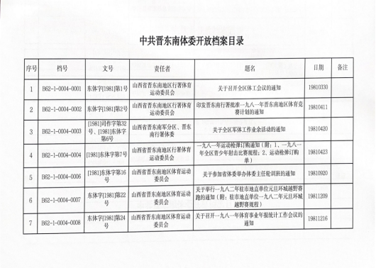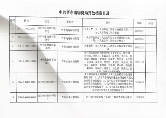 本次开放档案涉及16个全宗,共开放8618件,分别为中共晋东南地委政法委员会、中共晋东南地委老干部局、晋东南地区档案局、晋东南地区农业委员会、晋东南地区财贸办公室、晋东南地区知青办公室、晋东南地区工商局、晋东南地区审计局、晋东南地区司法局、晋东南地区物资局、山西省煤炭运销总公司晋东南分公司、晋东南地区文联、中共晋东南地区对台办、晋东南地区广播事业局、晋东南地区电大工作站、晋东南地区体委,均形成于1950年至1985年。其中中共晋东南地委政法委员会全宗开放159件;中共晋东南地委老干部局全宗开放198件;晋东南地区档案局全宗开放1654件;晋东南地区农业委员会全宗开放293件;晋东南地区财贸办公室全宗开放1571件;晋东南地区知青办公室全宗开放1402件;晋东南地区工商局全宗开放1443件;晋东南地区审计局全宗开放29件;晋东南地区司法局全宗开放139件;晋东南地区物资局全宗开放582件;山西省煤炭运销总公司晋东南分公司全宗开放139件;晋东南地区文联全宗开放183件;中共晋东南地区对台办全宗开放118件;晋东南地区广播事业局全宗开放552件;晋东南地区电大工作站全宗开放28件;晋东南地区体委全宗开放128件。该批档案真实记录了晋东南地区政治建设、经济发展、文化教育等领域的历史全貌,既是党和政府科学决策、工作查考的重要凭证,也是研究晋城地方历史、传承地域文化的珍贵史料。